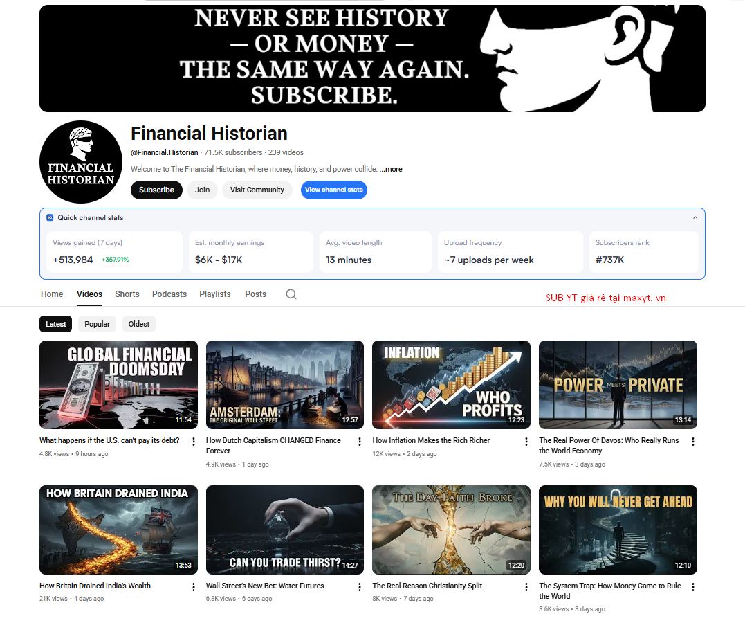 Case Study: Kênh Financial Historian với 72K Subscribers | 80 Video | 4.2M Views