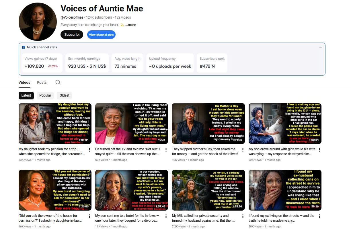 AI + kể chuyện drama, bạn có thể tạo ra kênh triệu view mà không cần lộ mặt. Kênh “Voices of Auntie Mae” đang làm: 104.000 subscribers 12 triệu lượt x...