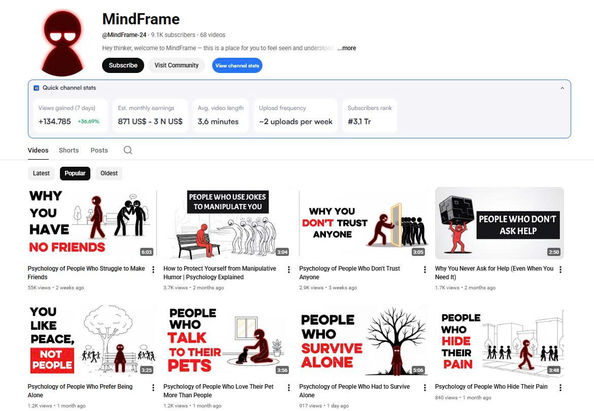 MindFrame là một kênh YouTube tập trung vào tâm lý học, tự nhận thức, hành vi con người, được kể lại bằng hình que tối giản kết hợp giọng kể chậm, trầm và đầy chiều sâu.