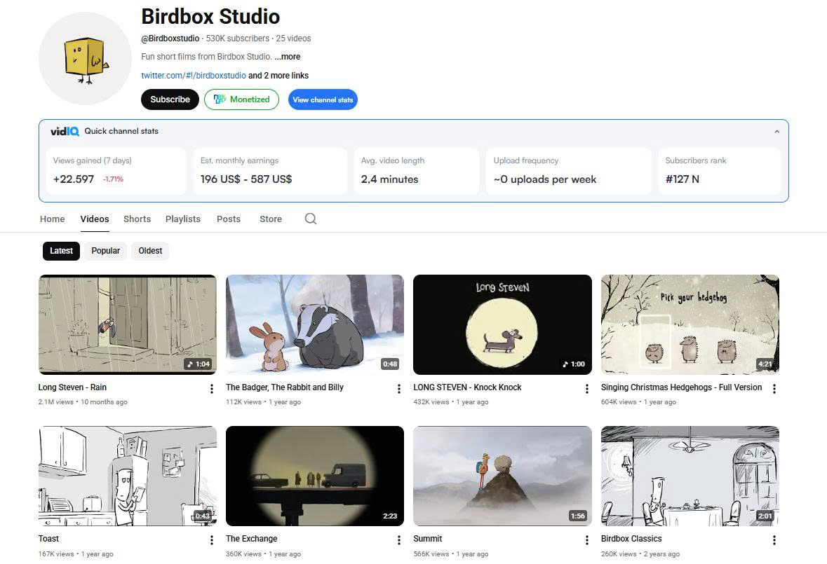 Birdbox Studio hiện sở hữu hơn 530.000 người đăng ký cùng khoảng 25 video được đăng tải. Nội dung chủ yếu của kênh là phim hoạt hình ngắn (short films) với thời lượng chỉ từ 1 đến 4 phút, nhưng vẫn truyền tải được những câu chuyện ý nghĩa.
