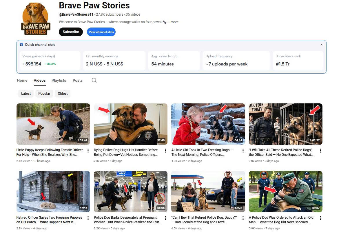 Gần đây, cộng đồng YouTube quốc tế bắt đầu chú ý đến Brave Paw Stories – một kênh nội dung cảm xúc xoay quanh các câu chuyện về chó cảnh sát, thú cưng bị bỏ rơi và những khoảnh khắc nhân văn giữa người và động vật.