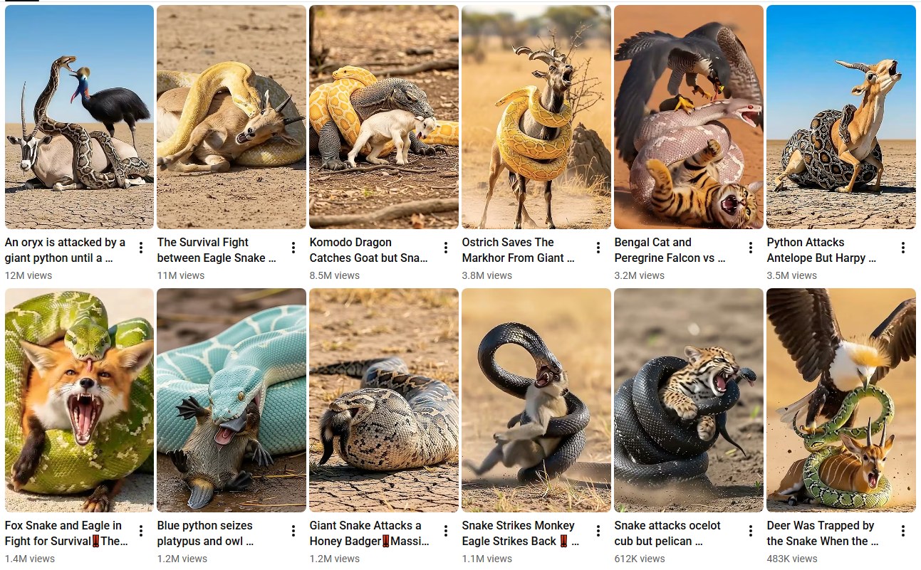 Phần 1: Một chuỗi hành động hoang dã dọc có độ nét cao, được đặt trong vùng saavannah châu Phi tươi sáng, ngập nắng. Khung cảnh mở ra với một con trăn khổng lồ, có họa tiết cuộn quanh cành cây khô không lá, há miệng xuống phía dưới. Nó nằm trên một chiếc Gemsbok oryx, ngay lập tức quấn thân cơ dày, ôm chặt vào cổ và thân xương của con trong một cái ôm siêu thực. Thay vì sụp đổ, cây oryx đột nhập thành một con rắn điên rồ trên vùng đồng bằng cỏ khô, mang theo con rắn khổng lồ vẫn được cuộn quanh khu vực giữa của nó như một con rắn sống. Máy ảnh theo dõi sự chuyển động của động vật từ bên cạnh khi nó chạy, ghi lại cảnh tượng kỳ lạ của con rắn cưỡi cây oryx gallop, với đuôi rắn đang rót trong không khí phía sau chúng dưới bầu trời trong xanh.
