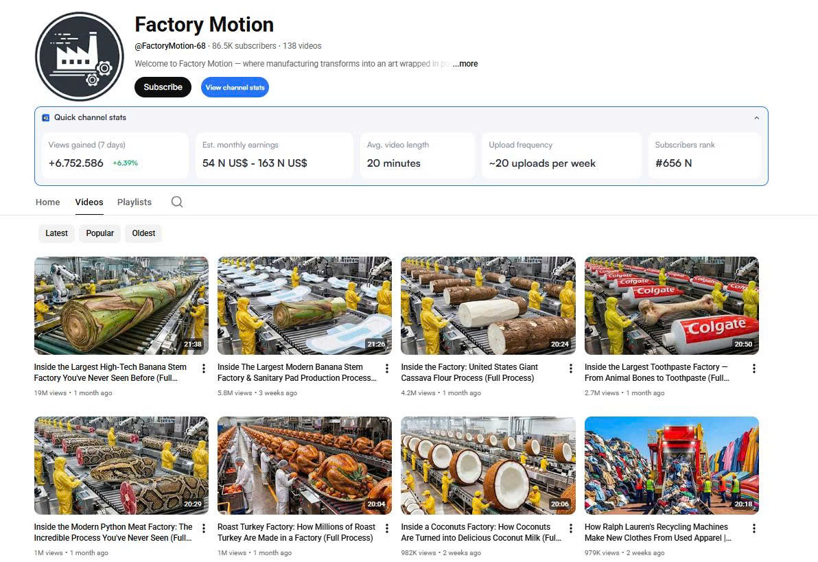 Giữa làn sóng YouTube faceless, Factory Motion đang nổi lên như một trong những kênh khai thác thành công nhất mảng quy trình sản xuất công nghiệp quy mô lớn. Với hơn 82.000 người đăng ký và 138 video, kênh liên tục tạo ra các video đạt từ hàng triệu đến hàng chục triệu lượt xem.