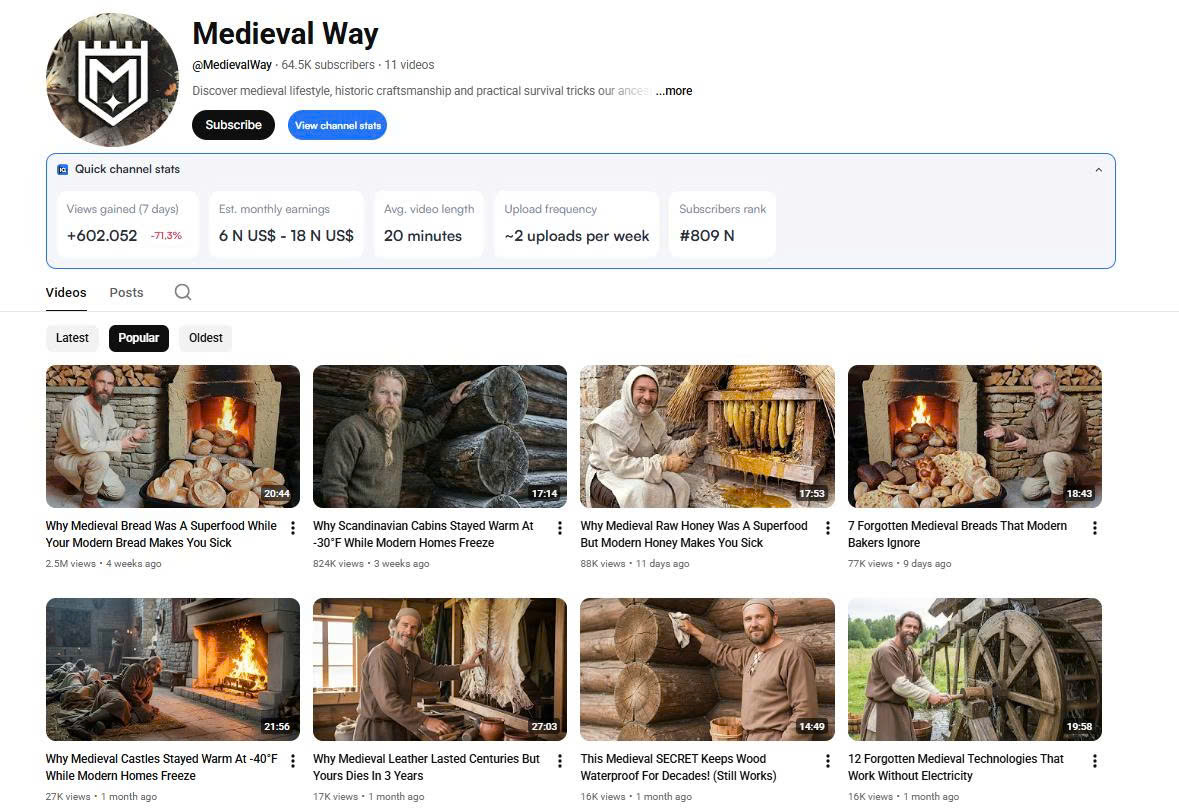 Kênh YouTube Medieval Way đã đạt 49K người đăng ký chỉ với 9 video