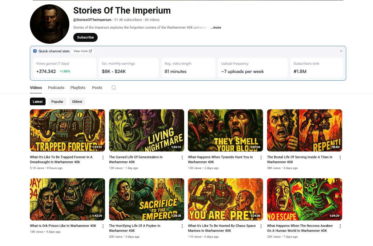 Kênh YouTube "Stories Of The Imperium" là nơi tập trung vào việc kể lại những câu chuyện và truyền thuyết trong vũ trụ giả tưởng đen tối của "Warhammer 40,000". Nội dung chính của kênh xoay quanh việc khám phá cuộc sống khắc nghiệt và tàn bạo của những người lính phục vụ trong Imperium, các trận chiến chống lại các mối đe dọa ngoài hành tinh như Tyranids, và những câu chuyện về các Titan hùng mạnh. Kênh đi sâu vào lịch sử và bối cảnh của thế giới Warhammer 40,000, mang đến cho người xem một cái nhìn chi tiết về các sự kiện, nhân vật và các phe phái khác nhau trong vũ trụ rộng lớn và phức tạp này.