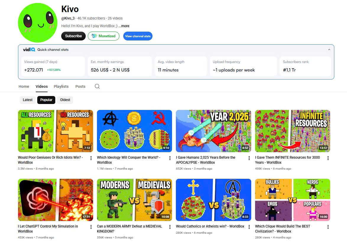 Trong bối cảnh nội dung sáng tạo ngày càng đa dạng, kênh YouTube Kivo đang nổi lên như một hiện tượng với phong cách làm video mô phỏng thế giới ảo đầy sáng tạo, đặc biệt xoay quanh tựa game sandbox WorldBox. Dù không phải kênh quá lâu đời, nhưng Kivo đang cho thấy tốc độ tăng trưởng ấn tượng và tiềm năng lớn trong ngách nội dung này.