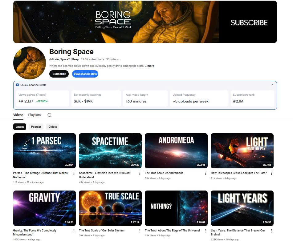 Kênh thuộc dạng “Slow Space Documentary – Chill Narration – Deep Space Explanations”, kết hợp kiến thức thiên văn chân thật với nhịp kể chậm, êm, tạo cảm giác thư giãn buồn ngủ. Đây là mô hình lai giữa Sleep Storytelling và Cosmos Documentary. Công thức: kiến thức vũ trụ khó → chuyển thành lời kể nhẹ → hình ảnh CGI/AI đẹp → video dài 2 giờ → watch time khổng lồ → view tăng đều.