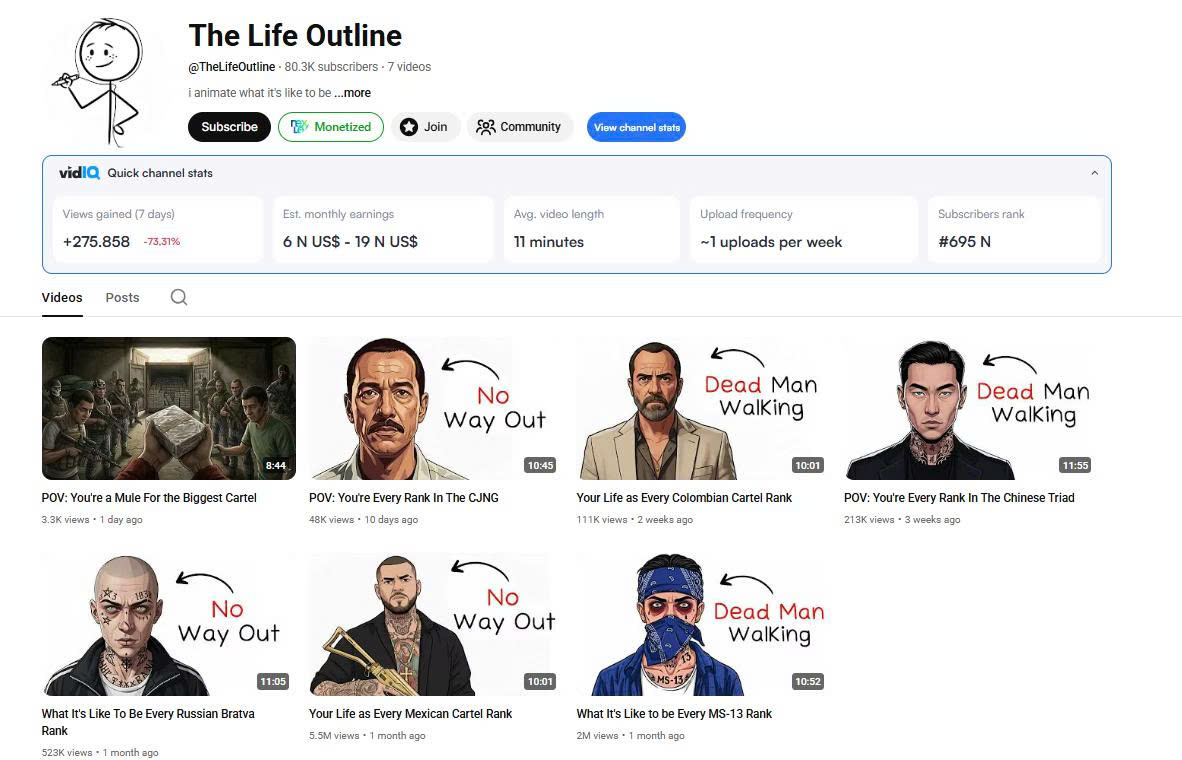 Kênh The Life Outline là ví dụ điển hình cho việc nội dung và storytelling quan trọng hơn hình ảnh phức tạp. Với chỉ vài video và phong cách hoạt hình đơn giản, kênh vẫn có thể đạt hàng triệu lượt xem nhờ chủ đề hấp dẫn và cách kể chuyện cuốn hút.