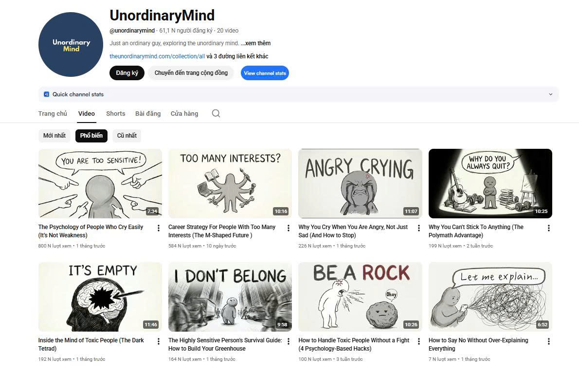 - Vị trí của UnordinaryMind: Kênh này chọn ngách "Deep Psychology" (Tâm lý sâu sắc). Họ dùng khoa học thần kinh để giải thích hành vi, biến sự "cả thèm chóng chán" thành một năng lực gọi là "Polymath". Đây là đại dương xanh.