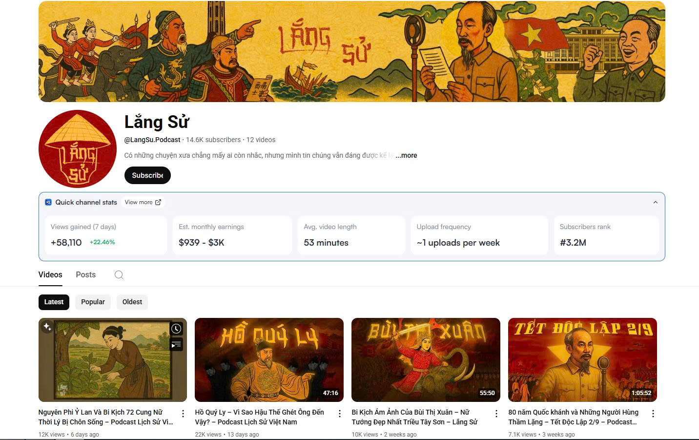 Mình vừa tìm được một kênh YouTube về Lịch sử Việt Nam, chỉ sau hơn hai tháng, đạt gần 14.500 người đăng ký và gần 600.000 lượt xem... Không cần lộ mặ...